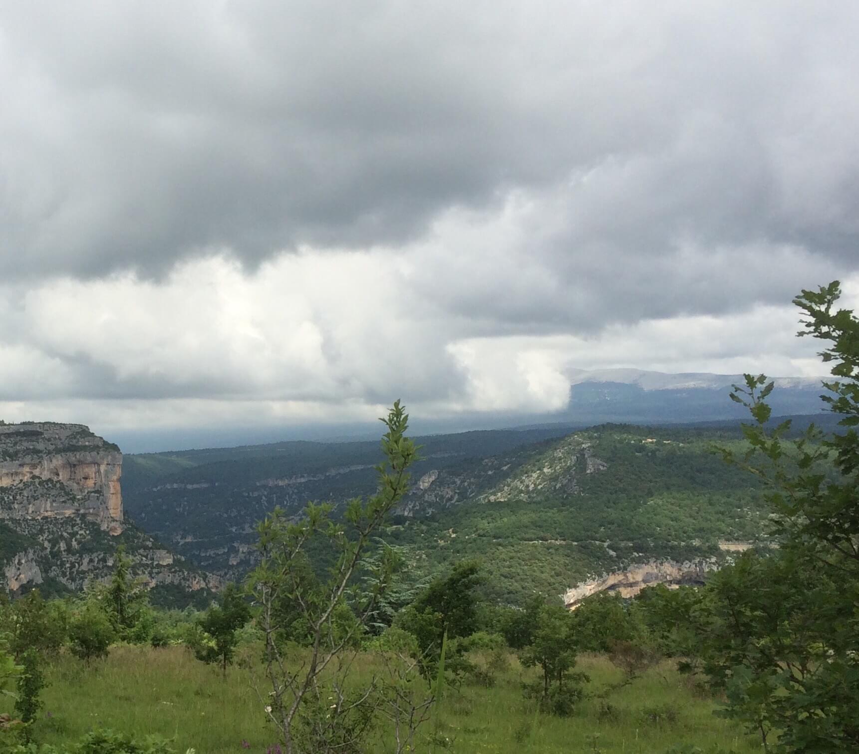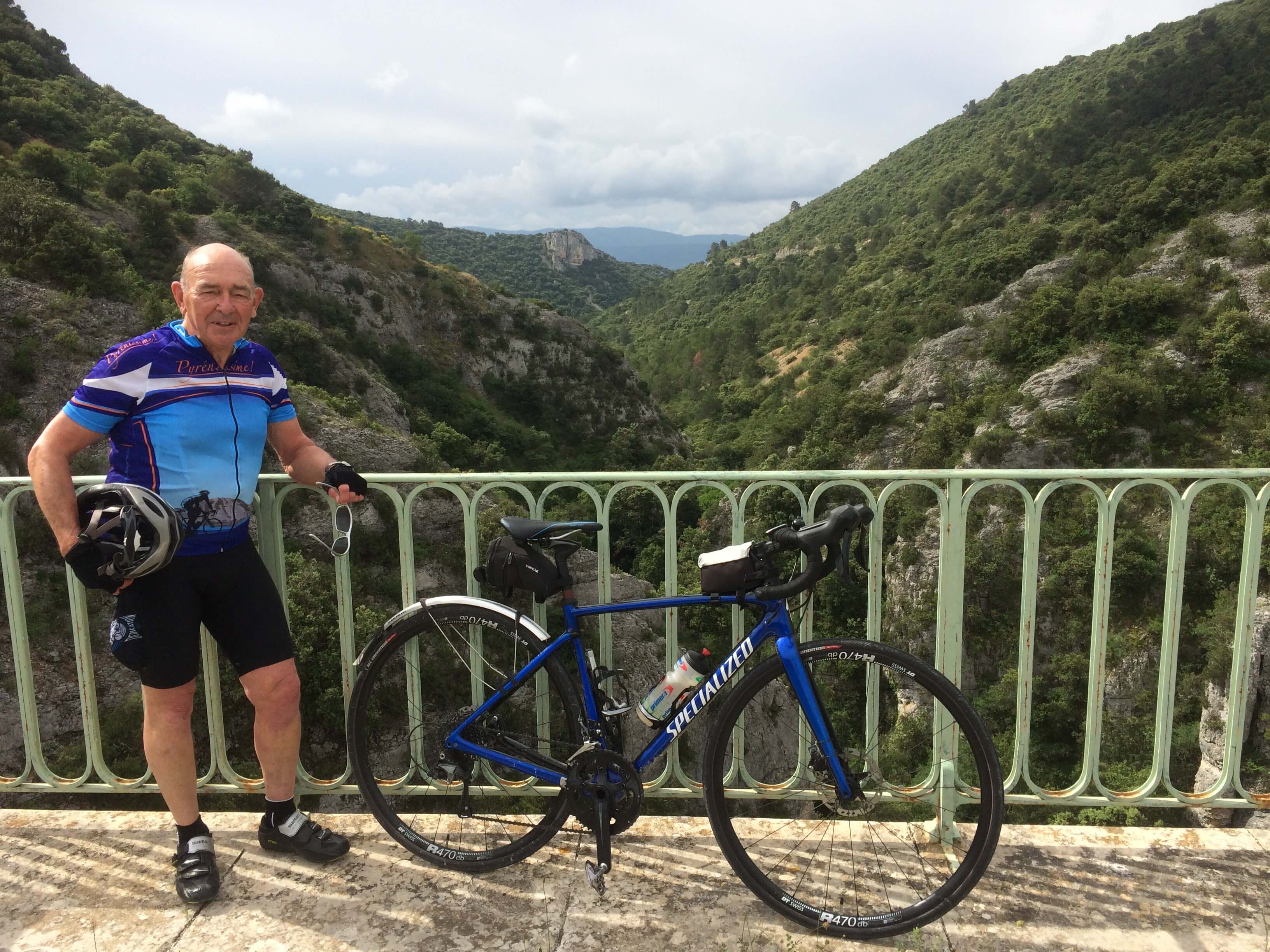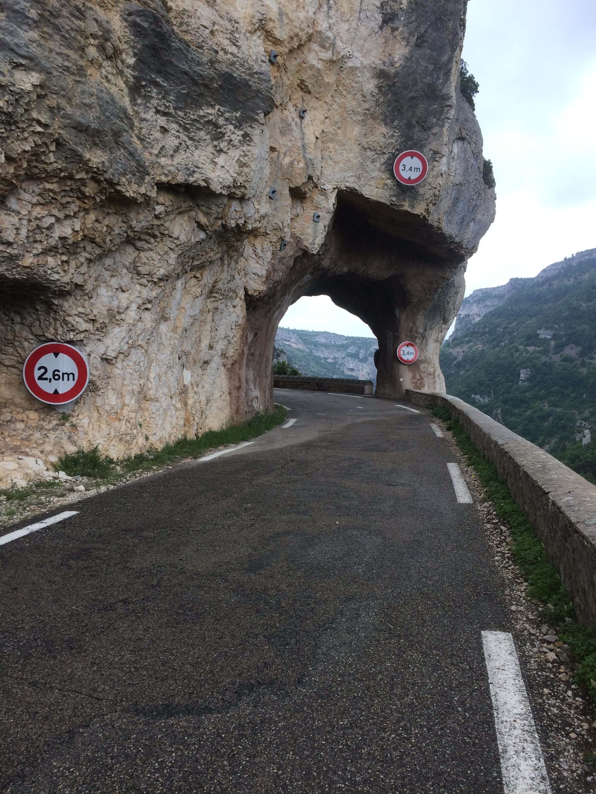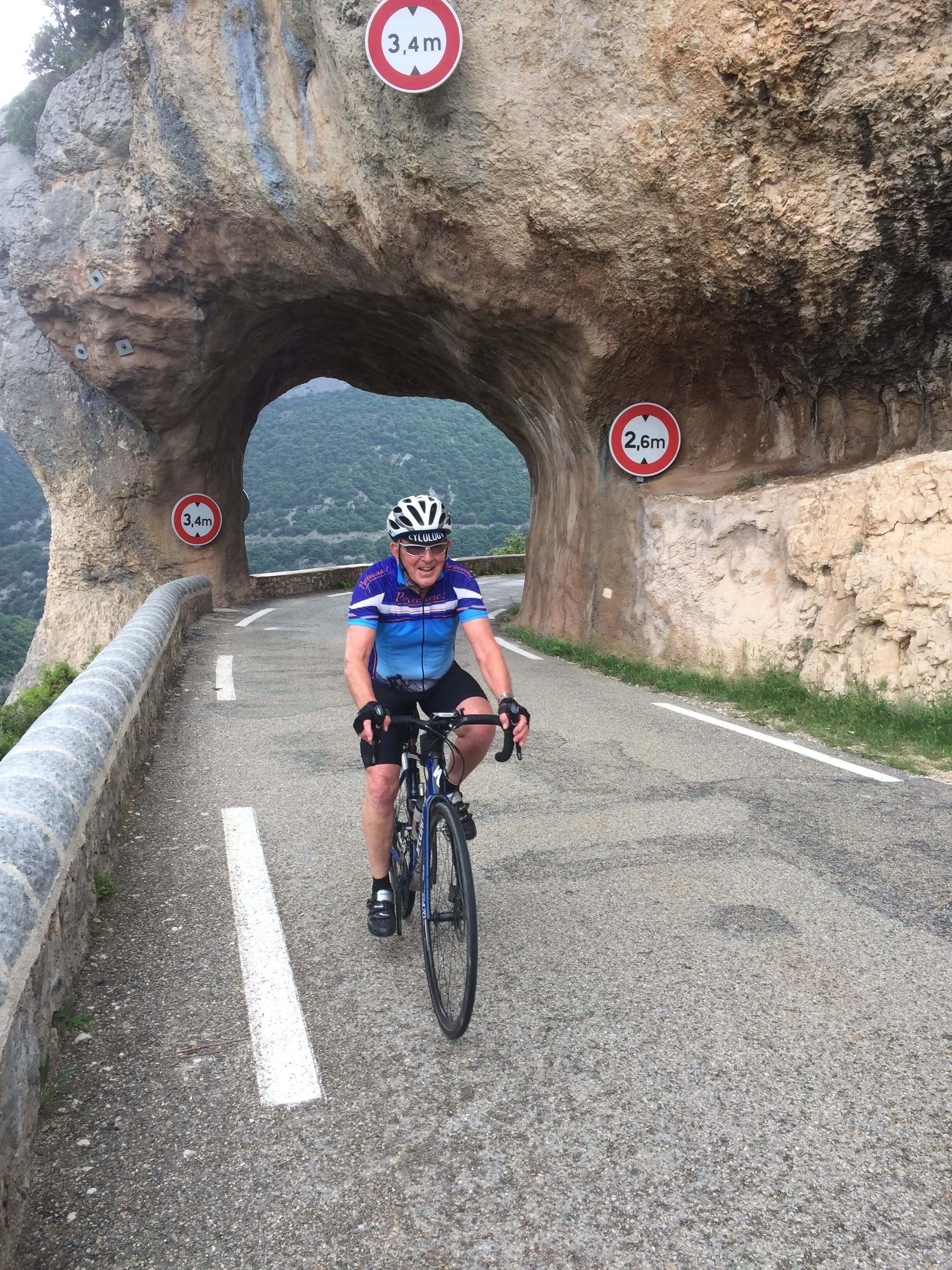 The road then plunged down for the next 10 or 12 miles on not the best surface so care had to be taken. A great reward for a morning’s climbing. Lunch was taken in a very nice restaurant at Ferme du Pezet just beyond St Esteve. Now came the best part of the day and perhaps the tour – a gentle climb up and around the very picturesque Gorge de la Nesque. The views into the gorge were dramatic with shear drops just beyond the edge of the road. The road passed through several arches carved into the rock. The road eventually decended towards Sault but kicked up quite sharply – yet another hilltop town.