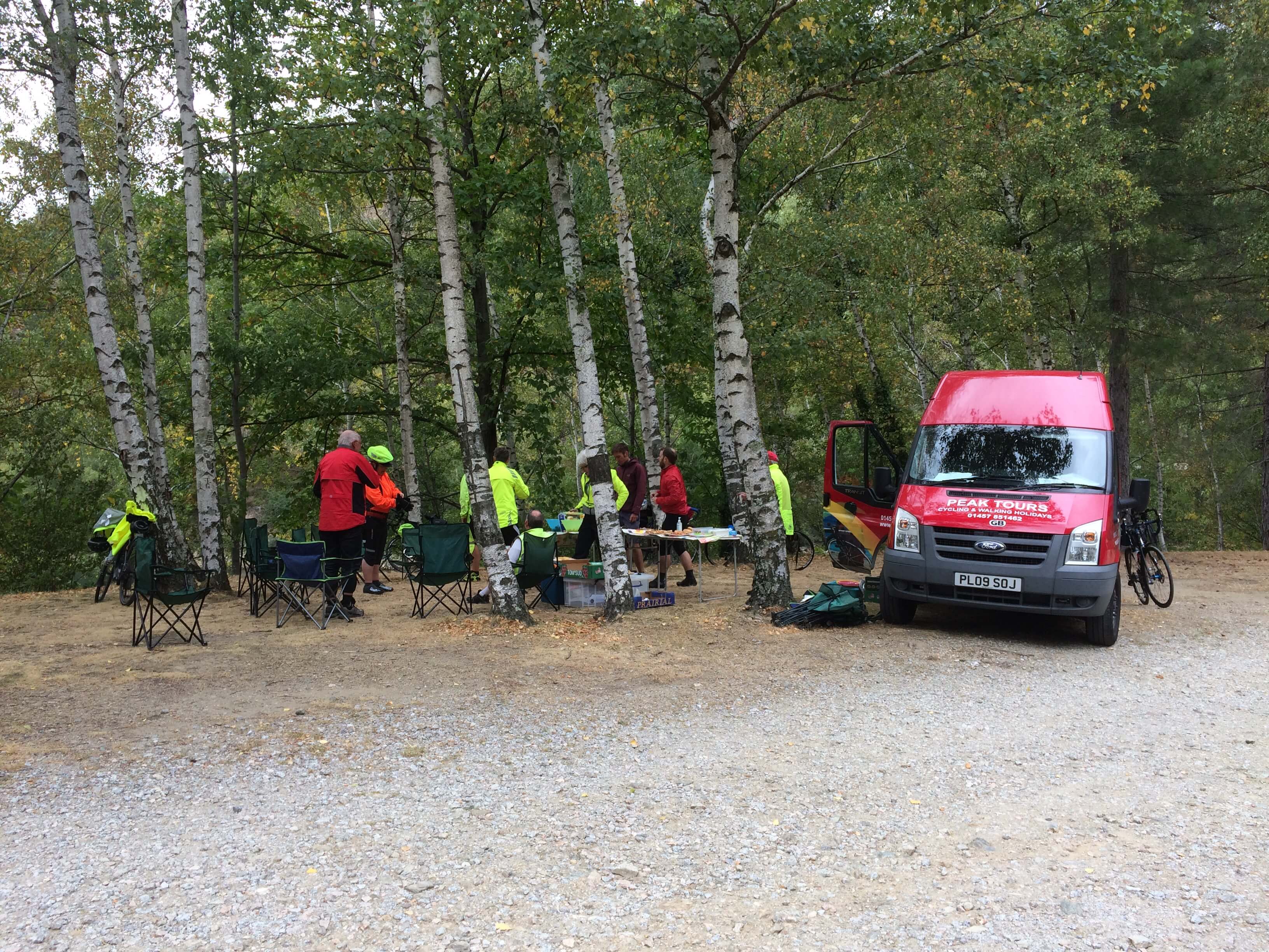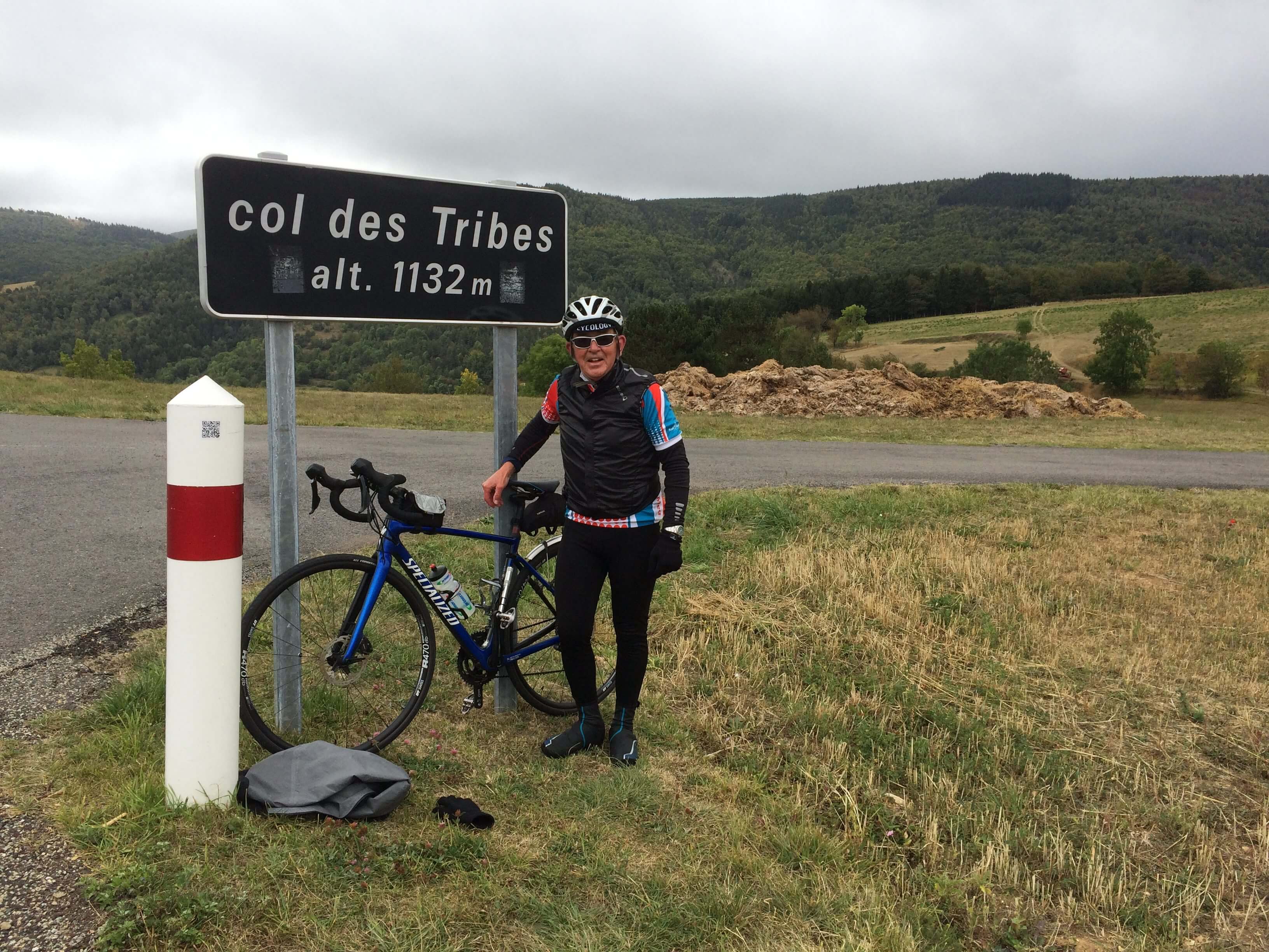 At our morning break it began to rain so on with waterproofs. Within a mile it stopped and the sun came out – so waterproofs off. The top of the climb was the Col des Tribes